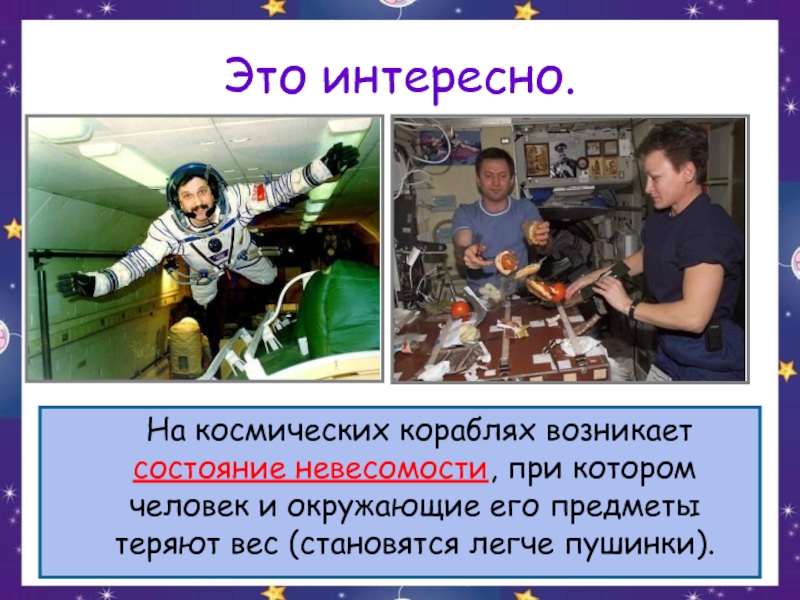 На космических кораблях возникает состояние невесомости, при котором человек и