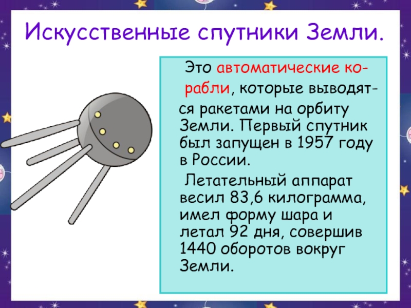 на орбиту Земли. Первый спутник был запущен в 1957 году в России.
