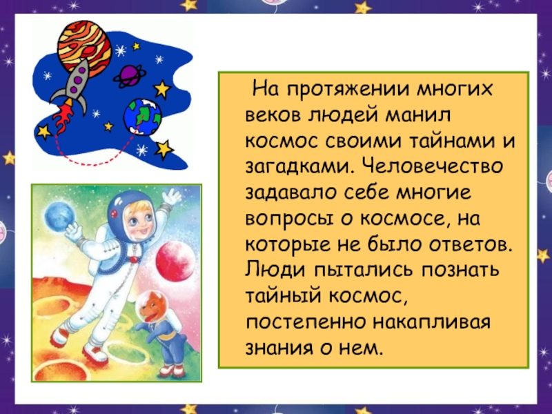 Слайд 4 На протяжении многих веков людей манил космос своими тайнами и загадками.