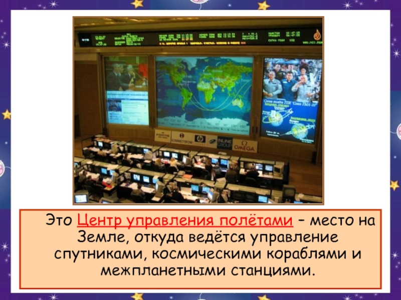 Слайд 25 Это Центр управления полётами – место на Земле, откуда ведётся управление