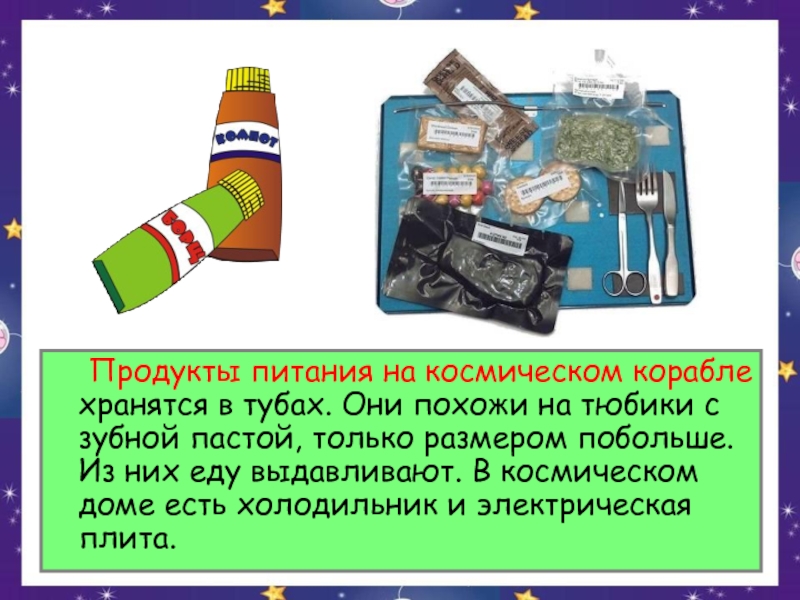 Слайд 23 Продукты питания на космическом корабле хранятся в тубах. Они похожи на