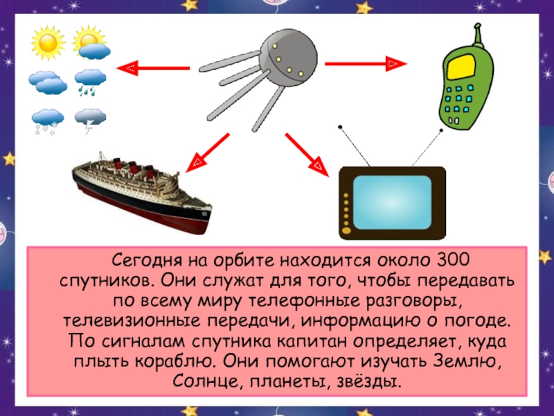 чтобы передавать по всему миру телефонные разговоры, телевизионные передачи, информацию о погоде. По сигналам спутника капитан определяет, куда плыть кораблю. Они помогают изучать Землю, Солнце, планеты, звёзды.