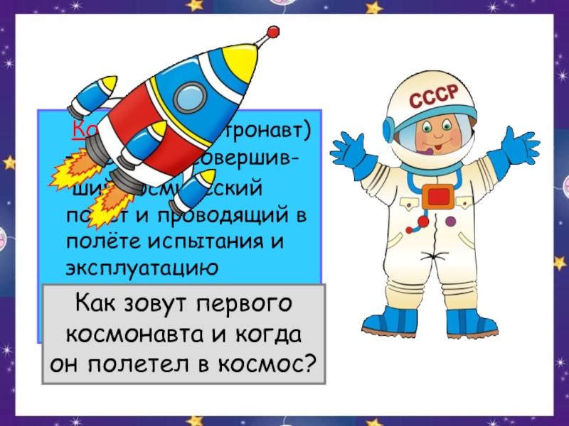 Слайд 11 Космонавт (астронавт) — человек, совершив-