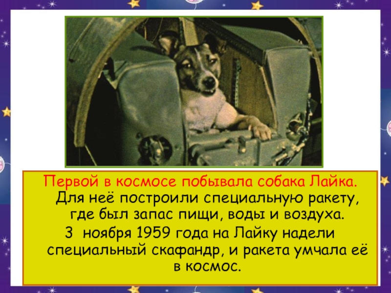 Слайд 8Первой в космосе побывала собака Лайка. Для неё построили специальную ракету,