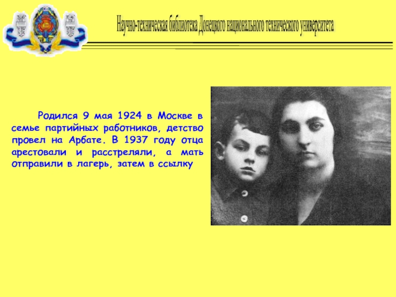 партийных работников, детство провел на Арбате. В 1937 году отца арестовали и расстреляли, а мать отправили в лагерь, затем в ссылку