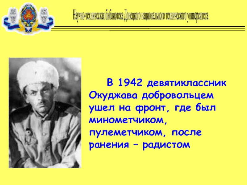 Слайд 3  В 1942 девятиклассник Окуджава добровольцем ушел на фронт, где