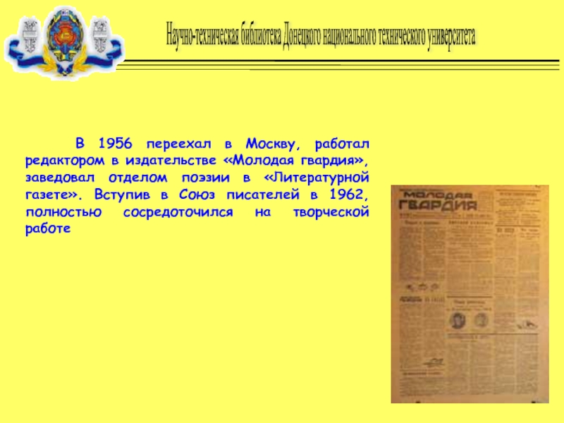 «Молодая гвардия», заведовал отделом поэзии в «Литературной газете». Вступив в Союз писателей в 1962, полностью сосредоточился на творческой работе