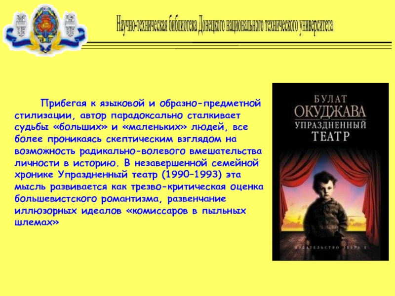 сталкивает судьбы «больших» и «маленьких» людей, все более проникаясь скептическим взглядом на возможность радикально-волевого вмешательства личности в историю. В незавершенной семейной хронике Упраздненный театр (1990–1993) эта мысль развивается как трезво-критическая оценка большевистского романтизма, развенчание иллюзорных идеалов «комиссаров в пыльных шлемах»