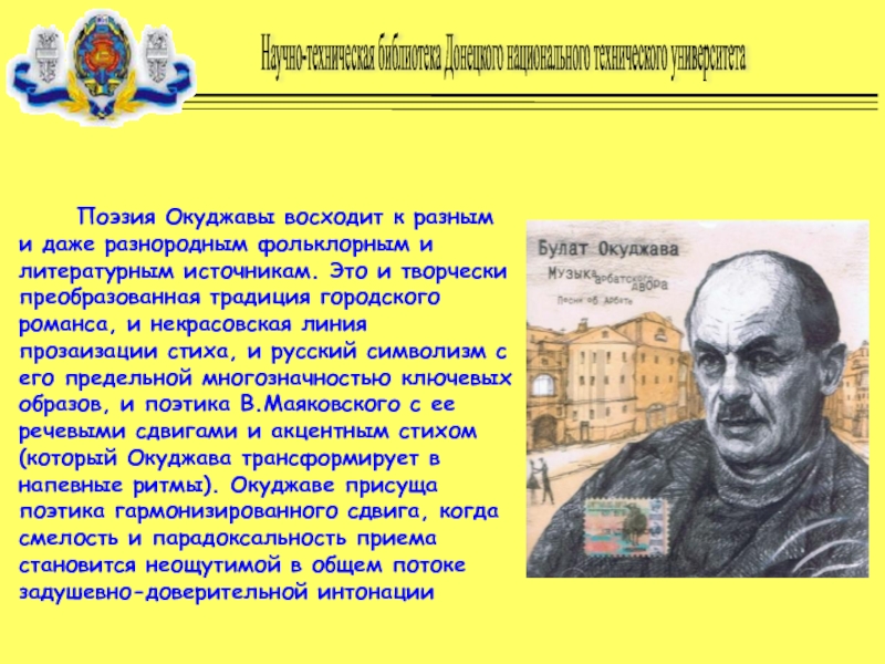 фольклорным и литературным источникам. Это и творчески преобразованная традиция городского романса, и некрасовская линия прозаизации стиха, и русский символизм с его предельной многозначностью ключевых образов, и поэтика В.Маяковского с ее речевыми сдвигами и акцентным стихом (который Окуджава трансформирует в напевные ритмы). Окуджаве присуща поэтика гармонизированного сдвига, когда смелость и парадоксальность приема становится неощутимой в общем потоке задушевно-доверительной интонации