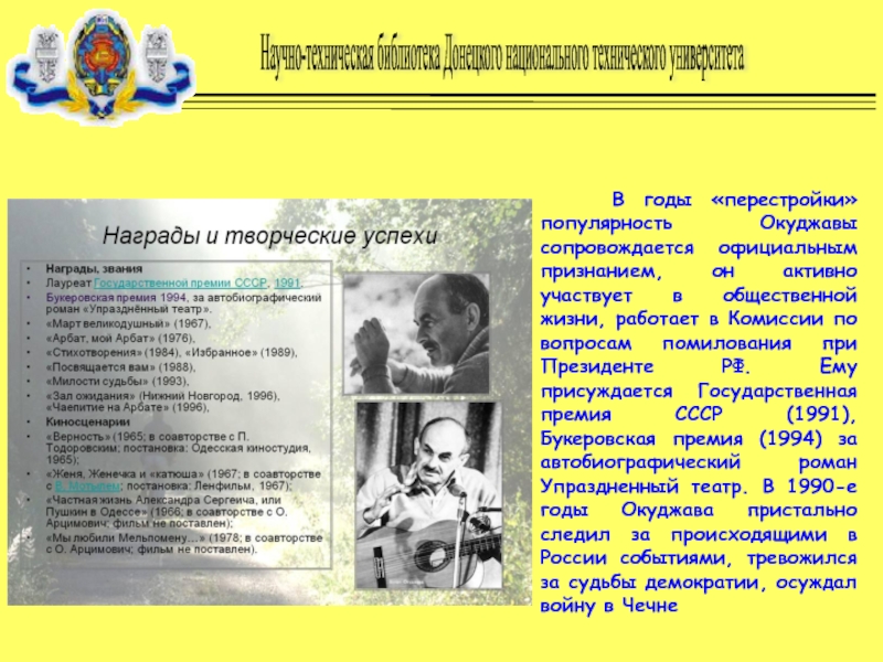 Слайд 8  В годы «перестройки» популярность Окуджавы сопровождается официальным признанием, он