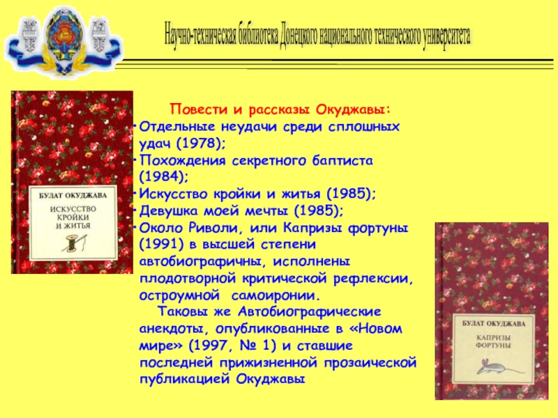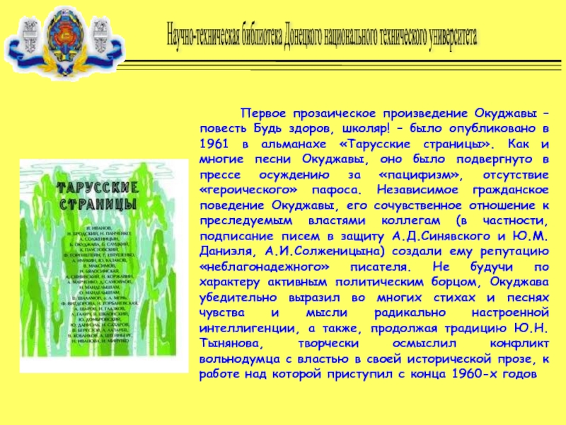 Слайд 7     Первое прозаическое произведение Окуджавы – повесть