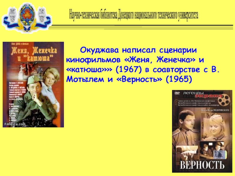 Слайд 14  Окуджава написал сценарии кинофильмов «Женя, Женечка» и «катюша»» (1967)