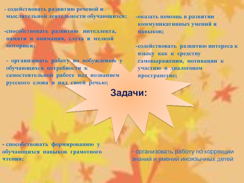 - организовать работу по коррекции знаний и умений иноязычных детей