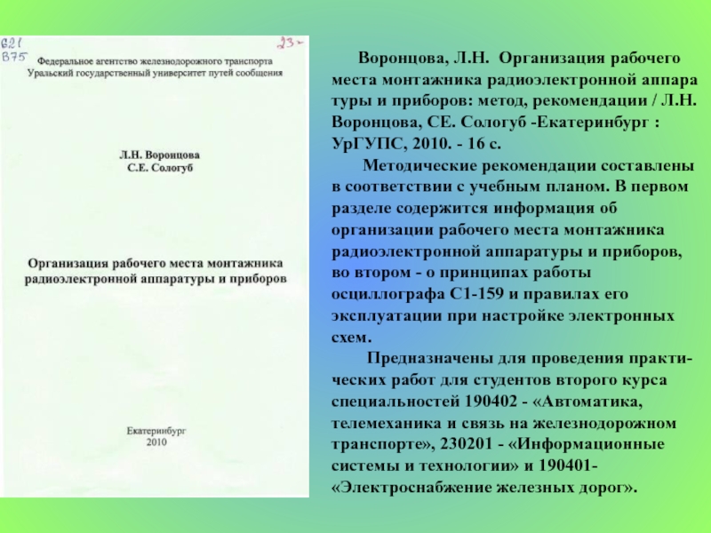 Пособие предназначено для студентов специальности 190402 — «Автоматика, телемеханика и связь на железнодорож-ном транспорте» и может использовать-ся как на аудиторных занятиях, так и при самостоятельной работе студентов.