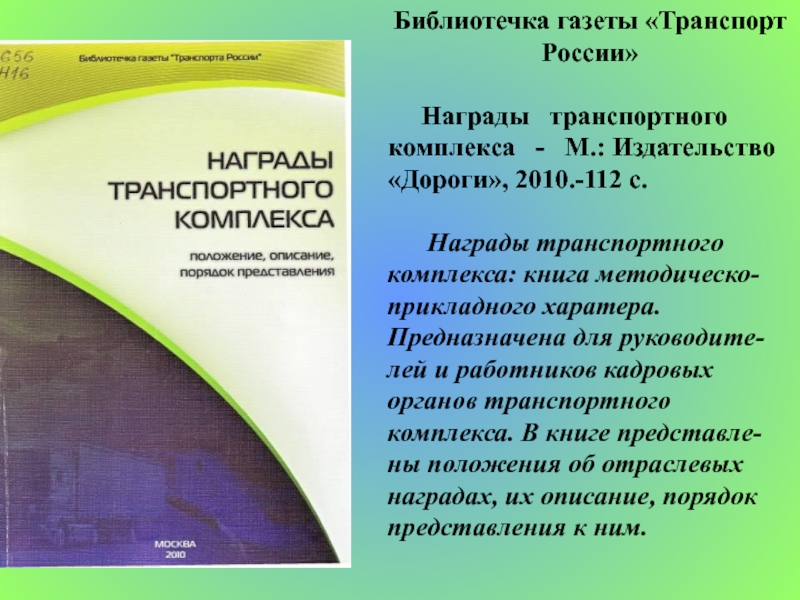 Награды транспортного комплекса: книга методическо-прикладного харатера. Предназначена для руководите-лей и работников кадровых органов транспортного комплекса. В книге представле-ны положения об отраслевых наградах, их описание, порядок представления к ним.