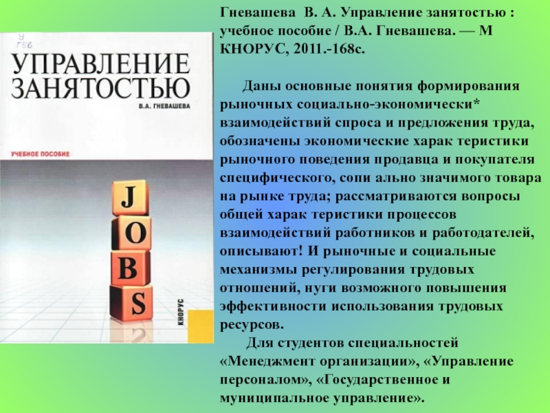 Слайд 11Гневашева В. А. Управление занятостью : учебное пособие / В.А. Гневашева.
