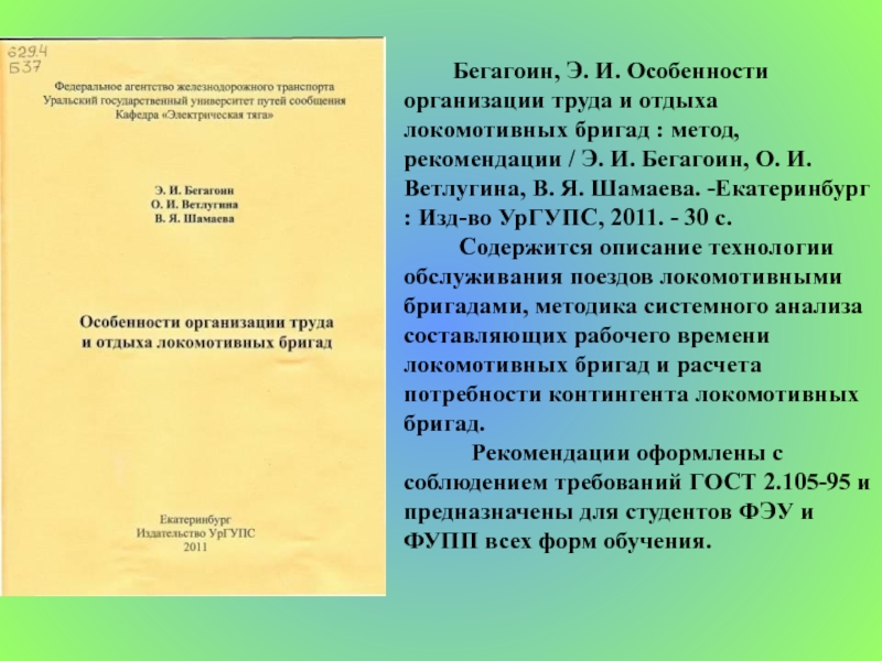 отдыха локомотивных бригад : метод, рекомендации / Э. И. Бегагоин, О. И. Ветлугина, В. Я. Шамаева. -Екатеринбург : Изд-во УрГУПС, 2011. - 30 с.