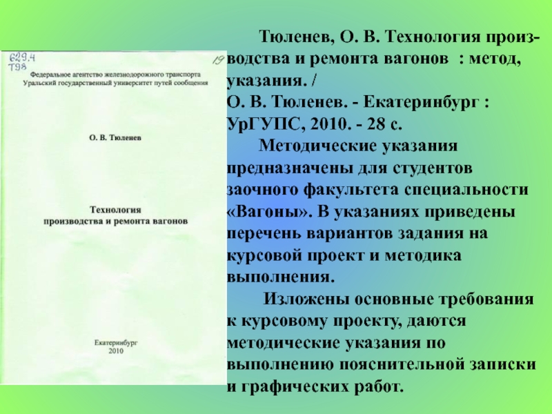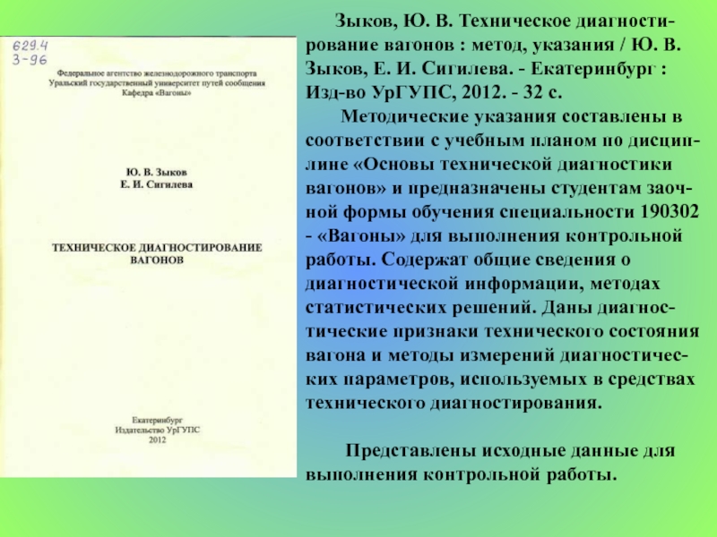 Слайд 99 Зыков, Ю. В. Техническое диагности-рование вагонов : метод,