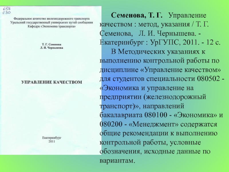 В Методических указаниях к выполнению контрольной работы по дисциплине «Управление качеством» для студентов специальности 080502 - «Экономика и управление на предприятии (железнодорожный транспорт)», направлений бакалавриата 080100 - «Экономика» и 080200 - «Менеджмент» содержатся общие рекомендации к выполнению контрольной работы, условные обозначения, исходные данные по вариантам.