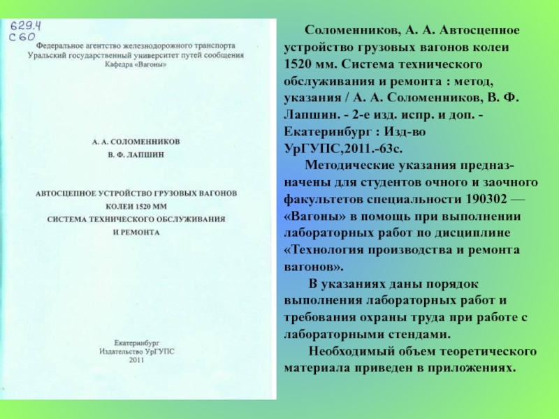 Слайд 100 Соломенников, А. А. Автосцепное устройство грузовых вагонов колеи