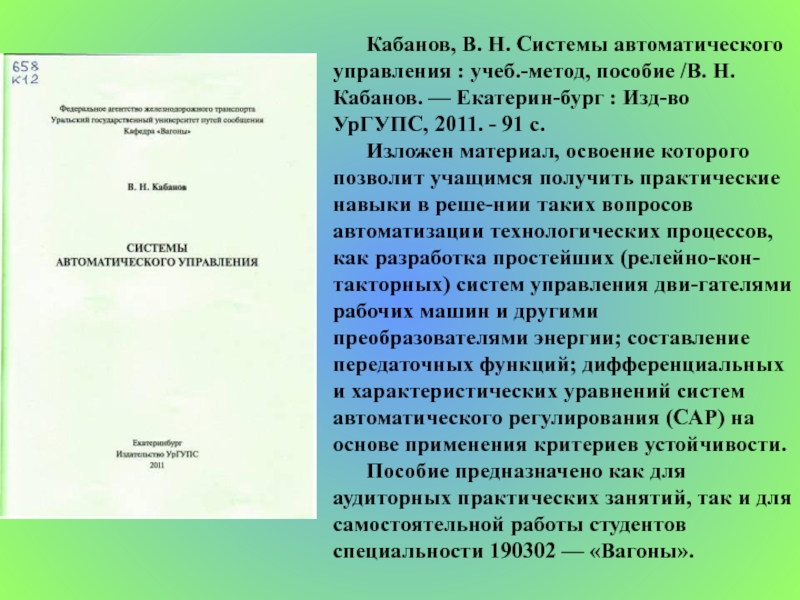 Кабанов, В. Н. Системы автоматического управления : учеб.-метод,