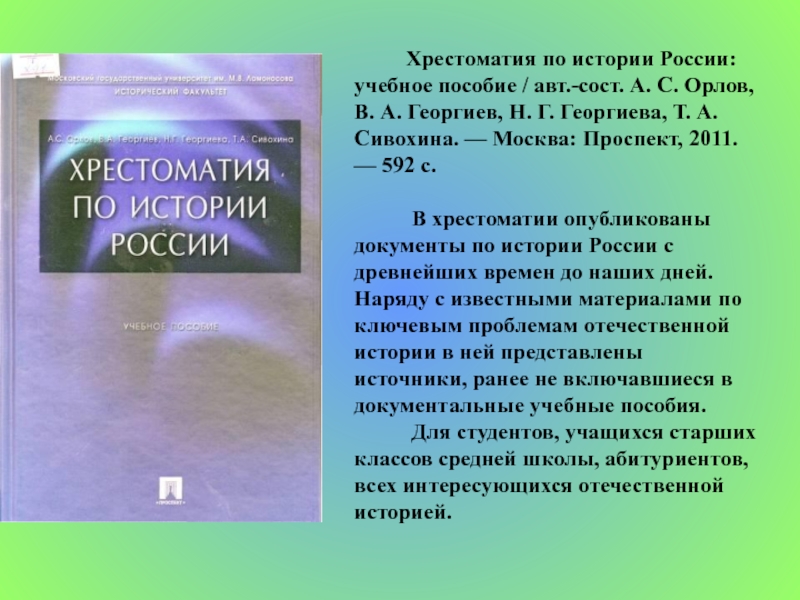 В хрестоматии опубликованы документы по истории России с древнейших времен до наших дней. Наряду с известными материалами по ключевым проблемам отечественной истории в ней представлены источники, ранее не включавшиеся в документальные учебные пособия.
