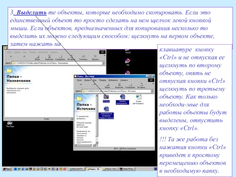 2. Расположить на экране эти папки таким образом, чтобы были видны как «Папка-Источник», так и «Папка-Назначение» - см. ранее «Работа с окнами-перемещение»