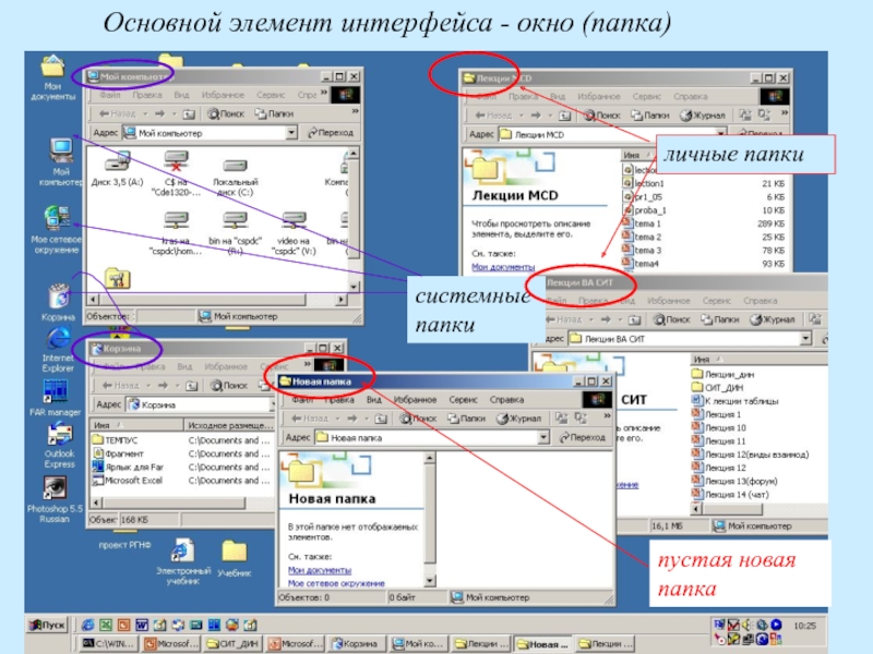 Объекты, помещенные в корзину, не удаляются физически и продолжают занимать место на жестком диске компьютера. Удаленные в корзину объекты можно восстановить в то место (или иное), из которого объекты были удалены - аналогично ранее рассмотренному приему перемещения (копирования) объектов. Удаленный из корзины объект восстановлению не подлежит.