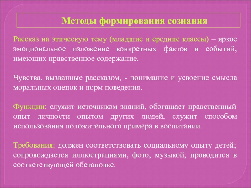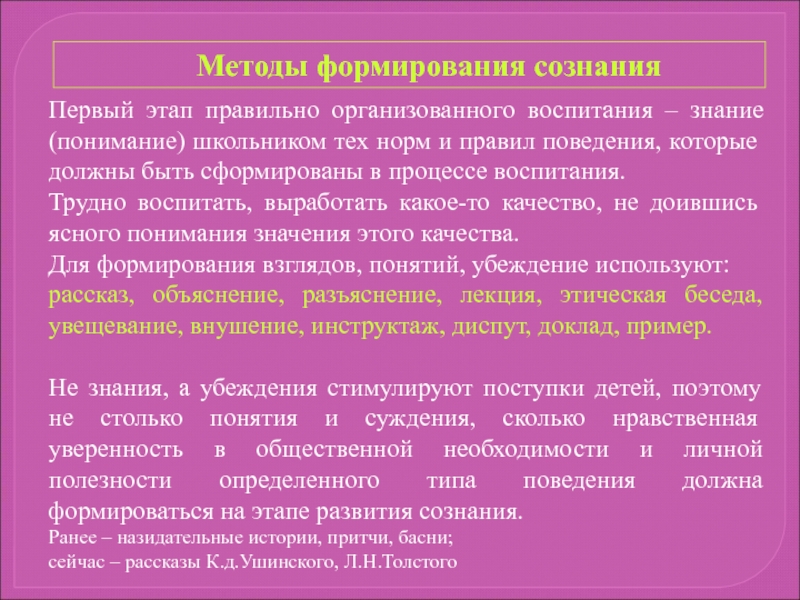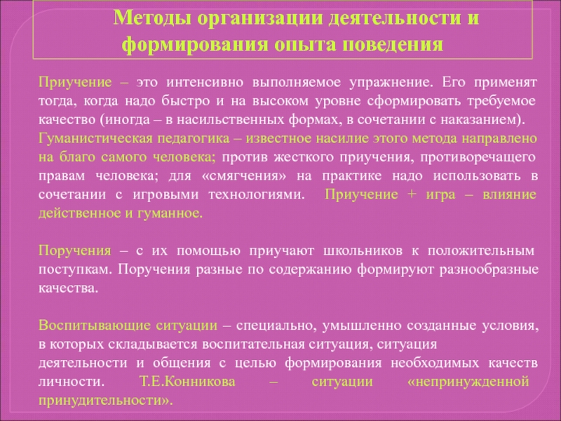Методы воспитания - это способы взаимодействия педагога и ребенка, в процессе которого происходит воздействие на сознание, чувства, волю, поведение и систему отношений воспитанника с целью формирования личности.