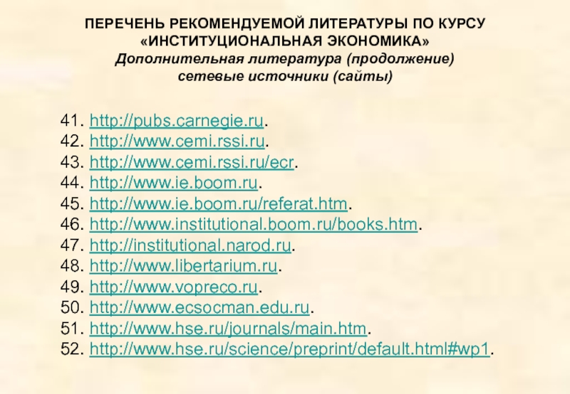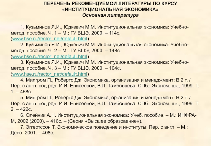 Институциональная экономика: Учебно-метод. пособие. Ч. 1 – М.: ГУ ВШЭ, 2000. – 114с. (www.hse.ru/rector_net/default.html)
