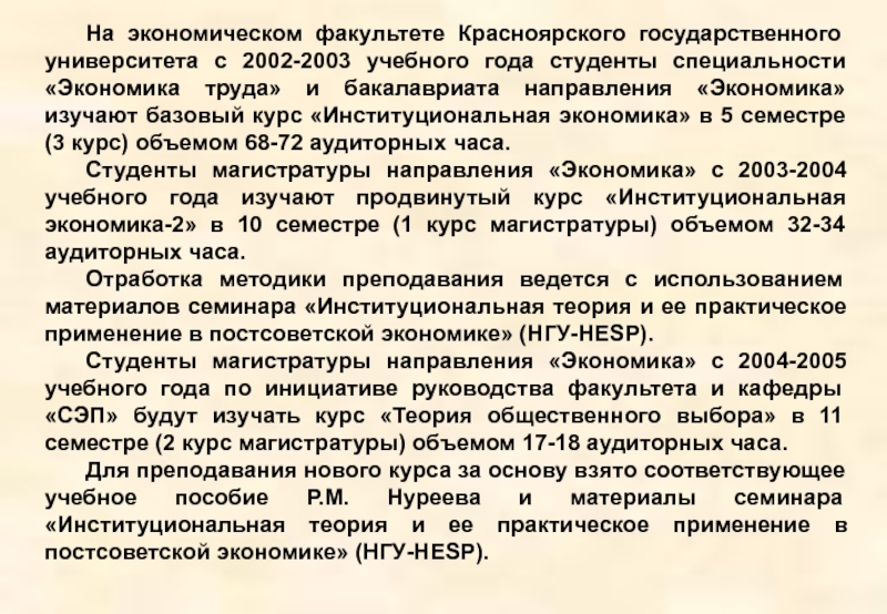 специальности «Экономика труда» и бакалавриата направления «Экономика» изучают базовый курс «Институциональная экономика» в 5 семестре (3 курс) объемом 68-72 аудиторных часа.