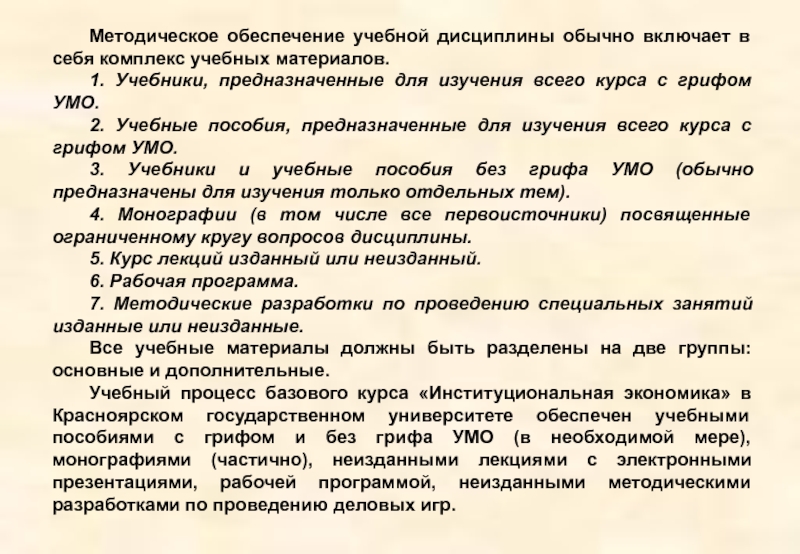 Учебный процесс базового курса «Институциональная экономика» в Красноярском государственном университете обеспечен учебными пособиями с грифом и без грифа УМО (в необходимой мере), монографиями (частично), неизданными лекциями с электронными презентациями, рабочей программой, неизданными методическими разработками по проведению деловых игр.