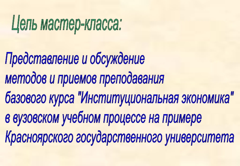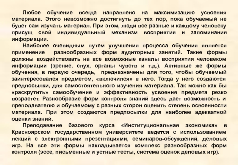 Преподавание базового курса «Институциональная экономика» в Красноярском государственном университете ведется с использованием лекций с электронными презентациями, семинаров-обсуждений, деловых игр. На все эти формы накладывается комплекс разнообразных форм контроля (эссе, письменные и устные тесты, система оценок деловых игр).