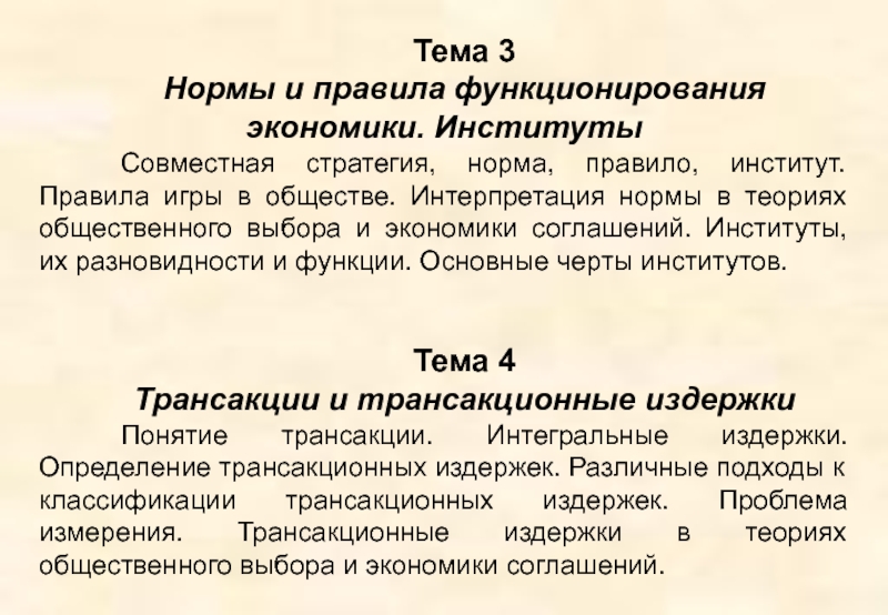 «Неоинституциональная экономическая теория: новый инструментарий. Объяснение правил. Экономическая теория исключительных прав. Структура прав собственности в фирмах и экономические результаты. Контактная природа фирмы. Логика экономической организации. Институциональное проектирование. Проявление прав собственности. Государство в неоинституциональной экономической теории.»