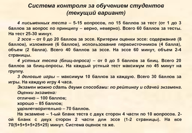 4 устных теста (блиц-опроса) – от 0 до 5 баллов за блиц. Всего 20 баллов за блиц-опросы. На каждый устный тест максимум по 45 минут на группу.