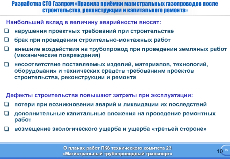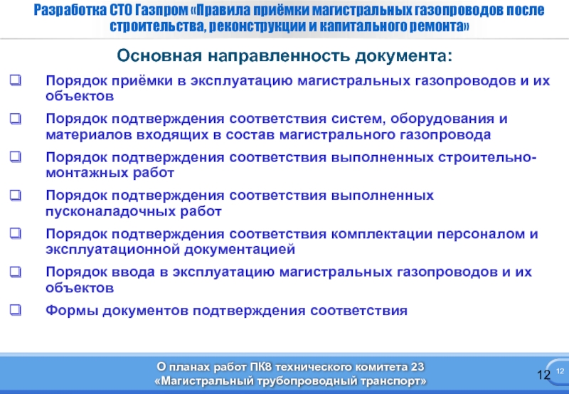 Разработка СТО Газпром «Правила приёмки магистральных газопроводов после строительства, реконструкции и капитального ремонта»