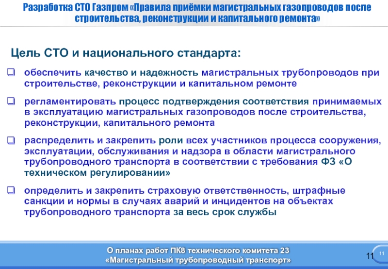 распределить и закрепить роли всех участников процесса сооружения, эксплуатации, обслуживания и надзора в области магистрального трубопроводного транспорта в соответствии с требования ФЗ «О техническом регулировании»