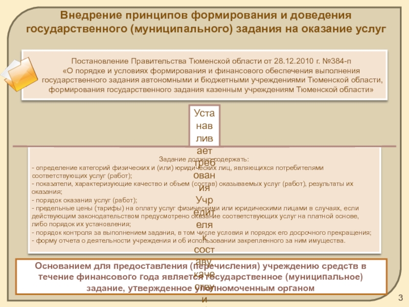 В соответствии с постановлением Правительства Тюменской области от 28.12.2010 г. №384-п «О порядке и условиях формирования и финансового обеспечения выполнения государственного задания автономными и бюджетными учреждениями Тюменской области, формирования государственного задания казенным учреждениям Тюменской области