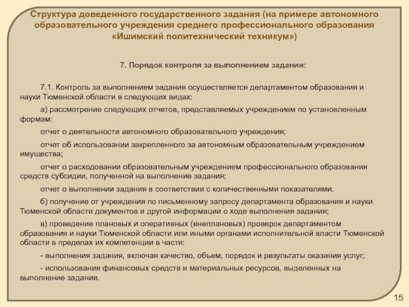 7.1. Контроль за выполнением задания осуществляется департаментом образования и науки Тюменской области в следующих видах: