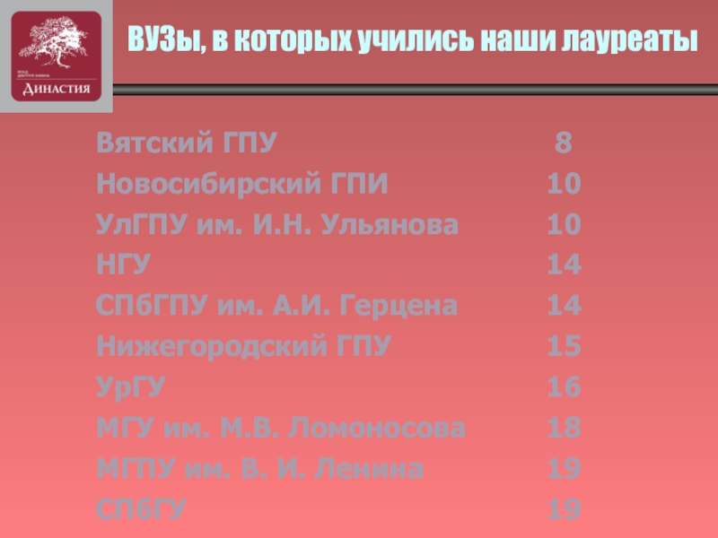 Слайд 24ВУЗы, в которых учились наши лауреаты