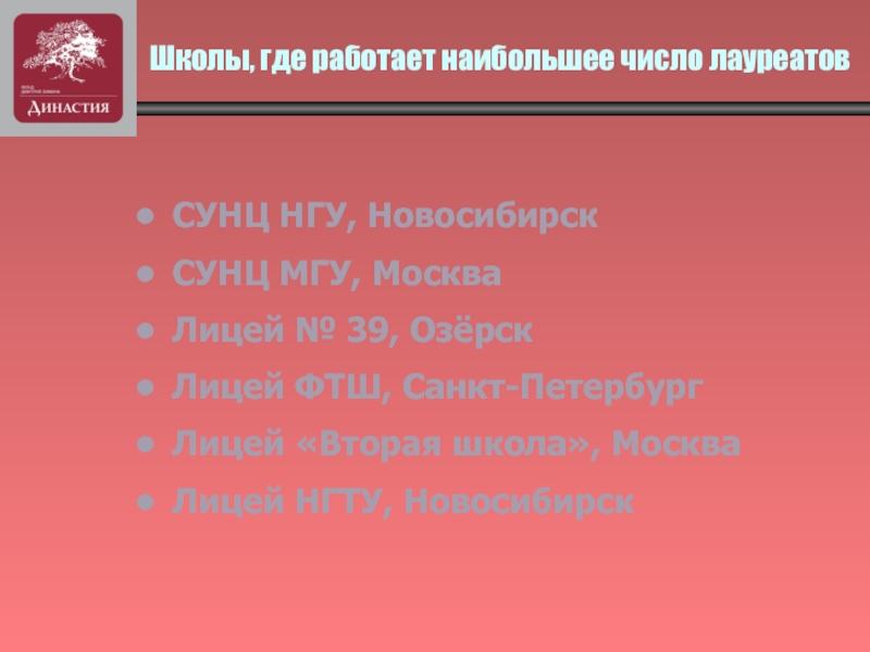 Слайд 20Школы, где работает наибольшее число лауреатов