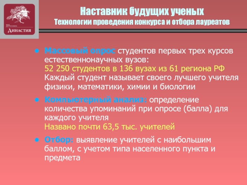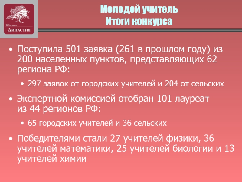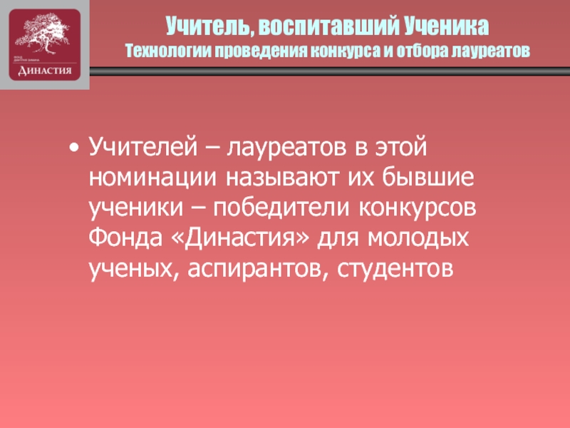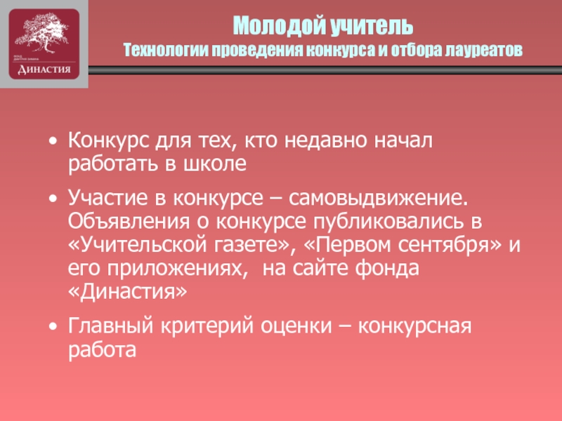 Участие в конкурсе – самовыдвижение. Объявления о конкурсе публиковались в «Учительской газете», «Первом сентября» и его приложениях, на сайте фонда «Династия»