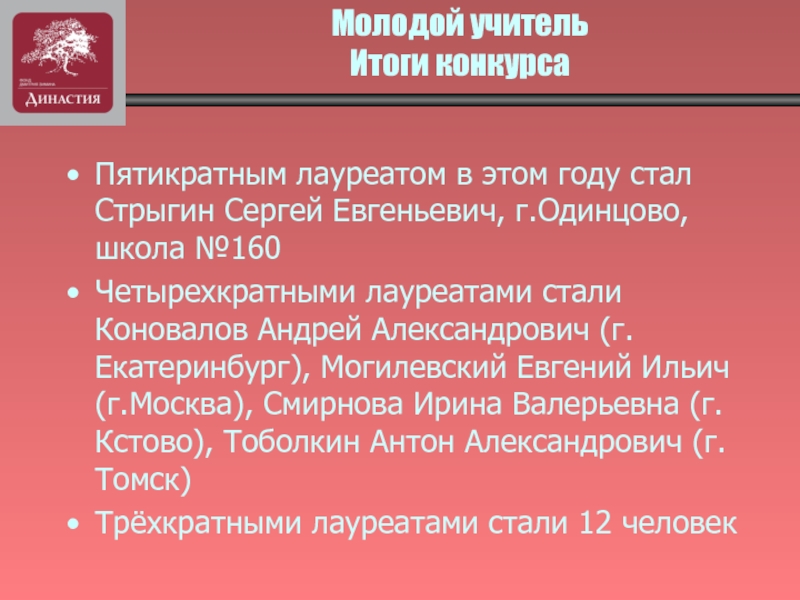 Четырехкратными лауреатами стали Коновалов Андрей Александрович (г.Екатеринбург), Могилевский Евгений Ильич (г.Москва), Смирнова Ирина Валерьевна (г.Кстово), Тоболкин Антон Александрович (г.Томск)