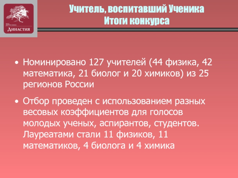 Отбор проведен с использованием разных весовых коэффициентов для голосов молодых ученых, аспирантов, студентов. Лауреатами стали 11 физиков, 11 математиков, 4 биолога и 4 химика