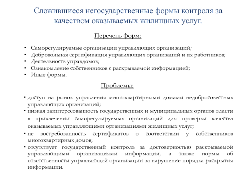низкая заинтересованность государственных и муниципальных органов власти в привлечении саморегулируемых организаций для проверки качества оказываемых управляющими организациями жилищных услуг;