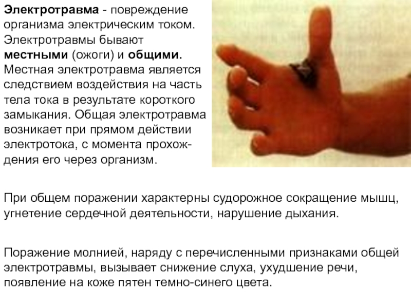 Электротравма - повреждение организма электрическим током. Электротравмы бывают местными (ожоги) и общими. Местная электротравма является следствием воздействия на часть тела тока в результате короткого замыкания. Общая электротравма возникает при прямом действии электротока, с момента прохож-дения его через организм.