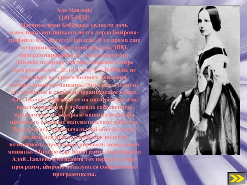 графиню Аду Августу Лавлейс. В то время еще не возникли такие понятия, как ЭВМ, программирование, и тем не менее Аду Лавлейс по праву считают первым в мире программистом. Дело в том, что Бэббидж не составил не одного полного описания изобретенной им машины. Это сделал один из его учеников в статье на французском языке.