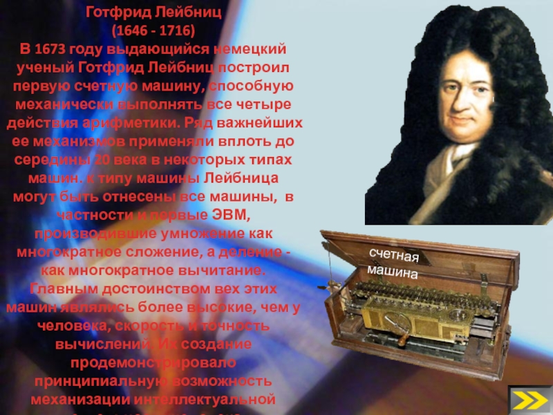 первую счетную машину, способную механически выполнять все четыре действия арифметики. Ряд важнейших ее механизмов применяли вплоть до середины 20 века в некоторых типах машин. к типу машины Лейбница могут быть отнесены все машины, в частности и первые ЭВМ, производившие умножение как многократное сложение, а деление - как многократное вычитание. Главным достоинством вех этих машин являлись более высокие, чем у человека, скорость и точность вычислений. Их создание продемонстрировало принципиальную возможность механизации интеллектуальной деятельности человека.