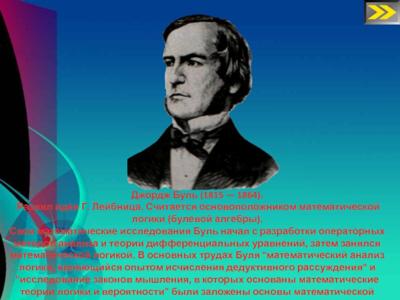 Свои математические исследования Буль начал с разработки операторных методов анализа и теории дифференциальных уравнений, затем занялся математической логикой. В основных трудах Буля "математический анализ логики, являющийся опытом исчисления дедуктивного рассуждения" и "исследование законов мышления, в которых основаны математические теории логики и вероятности" были заложены основы математической логики.