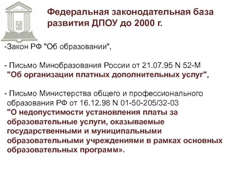 Федеральная законодательная база развития ДПОУ до 2000 г.